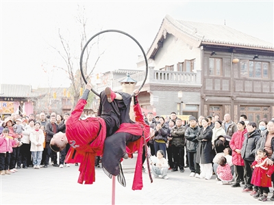 街巷之中,雜技表演輪番登場(chǎng),驚險(xiǎn)刺激的技藝展示贏得觀眾陣陣掌聲。在傾城一秀劇場(chǎng),貨郎造型演員帶來的相聲表演詼諧幽默、貼近生活,引得現(xiàn)場(chǎng)觀眾笑聲不斷。