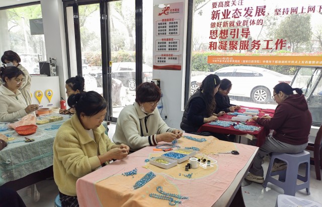 項目確定后, 街道婦聯(lián)廣泛咨詢、主動對接手工藝品加工企業(yè),并根據(jù)企業(yè)對成品的要求,組織有意愿嘗試的寶媽,開展手把手、面對面教學(xué)和培訓(xùn),從串珠的配色手法到縫扣子的針腳技巧,逐一拆解、反復(fù)演示,直至寶媽完全學(xué)會上手?!耙婚_始還擔(dān)心自己學(xué)不會,沒想到老師教得很細(xì),第一節(jié)課我就做出來了?!?nbsp;一位參訓(xùn)寶媽感慨道。
